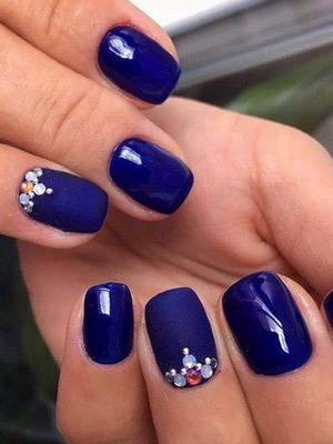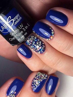 - На всех пальцах синий лак понравившегося вам оттенка, на одном – градиент камушками – от белого до темно-синего.