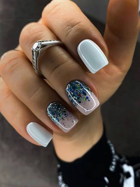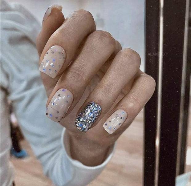 Если хочется чего-то более легкого, то можно полупрозрачные ноготки слегка присыпать серебряными блестками, а один ноготок сделать акцентным, и полностью выложить его такими же блестками. Будет и празднично и легко.