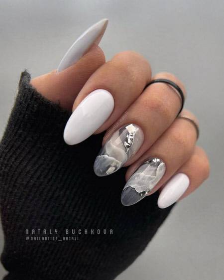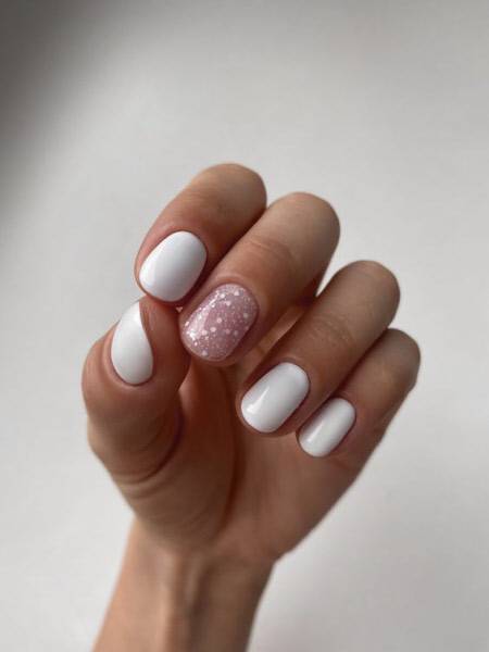 Белый лак для ногтей также выглядит волшебно на ногтях, особенно в сочетании с модным зимним дизайном, таким как мелкие узоры, абстракция или завитки.