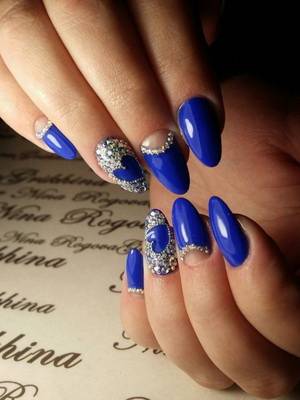 Миндалевидная форма удобна и более популярна. Особенно хорошо подойдет под однотонный синий маникюр. Матовый миндаль стоит украсить стразами около лунки, либо выбрать вариант декорирования одного ногтя. Беспроигрышный вариант: блестки, либо рисунки флоры или фауны.