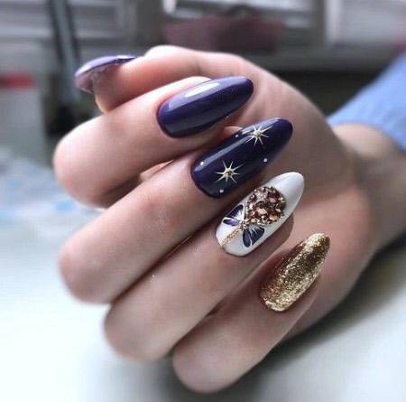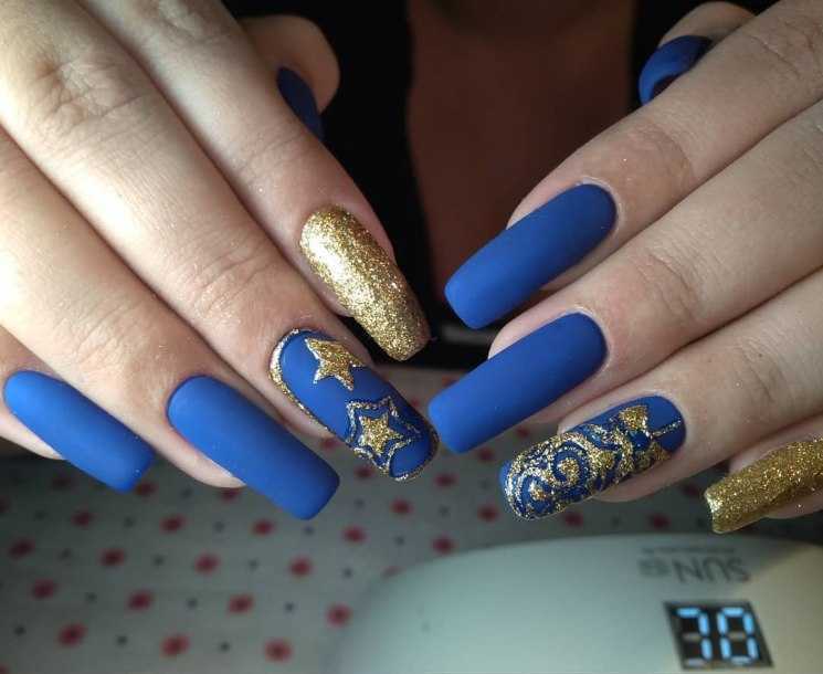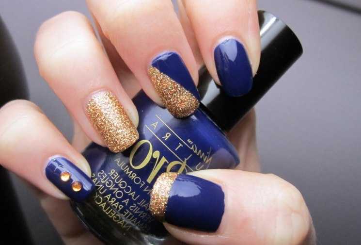 Очень выгодны смотрится синий в золотом обрамлении. Кроме того, золотом можно нарисовать геометрические фигуры. Это сейчас очень актуально и подходит к любому стилю. Стразы и декор в таком решении хороши «на выход».