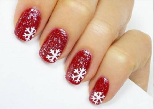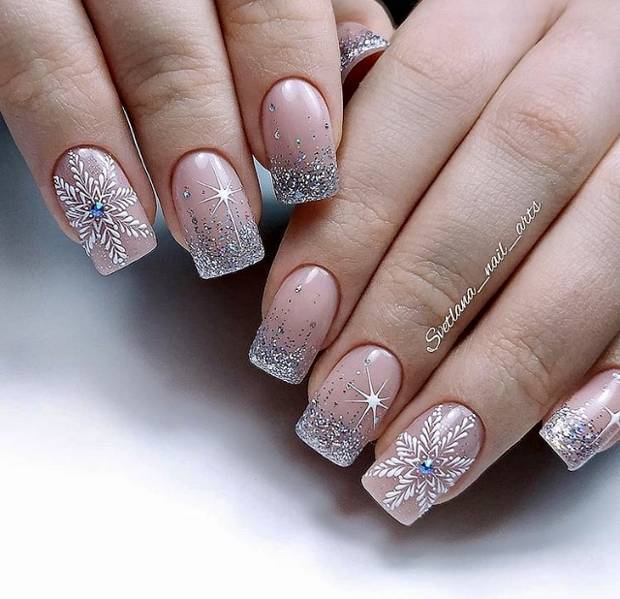 Маникюр со снежинками гель-лаком позволяет применять одну из следующих техник: