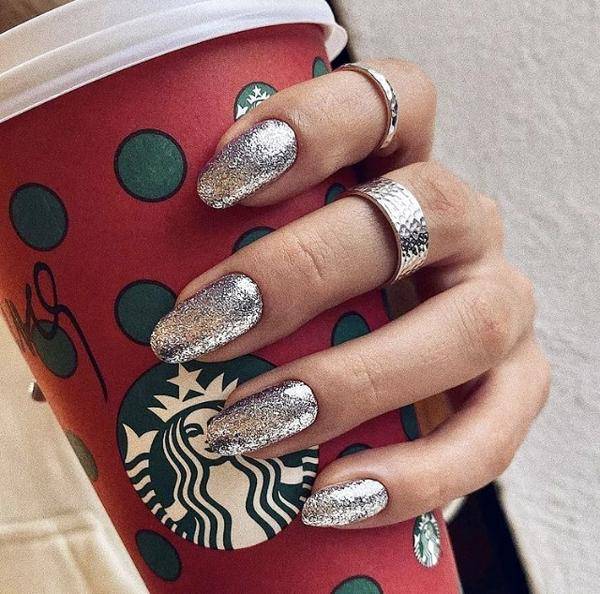 Также, довольно популярный тренд этого Новогоднего сезона — это серебро на ногтях. Причем, тоже как в чистом виде, так и в сочетании с разными цветами гель-лаков. И чем больше серебряного цвета на ваших ноготках, тем более крутым и модным будет считаться ваш дизайн. Ноготки полностью стального блестящего цвета будут выглядеть очень эффектно, ярко и точно выделят вас из толпы.