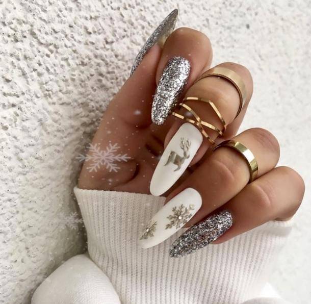 Белый — прекрасный выбор цвета для ногтей, потому что он подходит всем, выглядит потрясающе с блестками и подходит для любого новогоднего дизайна.