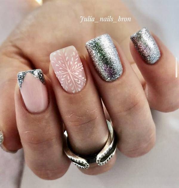 Также, очень эффектно будет смотреться сочетание серебра с нюдовыми матовыми ноготками или с парой белых ноготков. Плюс к этому дизайну, можно смело добавить рисунок снежинки белого или металлического цвета на один или два ногтя.