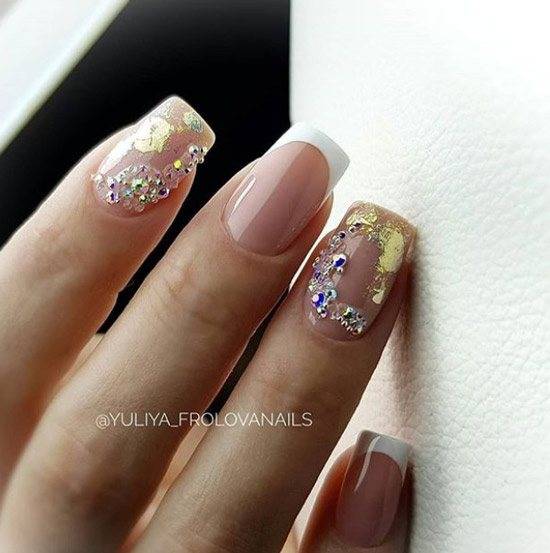 Минималистичный нежно-розовый маникюр с акцентами в виде стразов и плитки на безымянных пальцах – это верх женственности. Такой маникюр выглядит изысканно и не перегружен деталями.