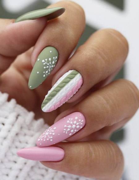 Миндальный маникюр в розово-белых тонах с изящными снежинками и рельефом в стиле “теплый свитер” – это модный зимний тренд сезона. Уникальный дизайн каждого ногтя делает общий образ очень оригинальным и подходящим для любого случая.