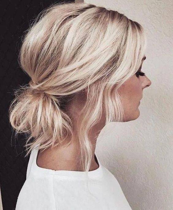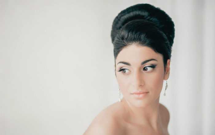 Для такой укладки нужно сформировать небольшой начёс на затылке. Прядки начёсывают, чтобы макушка была более пышной, собирают пучок на среднем уровне. Причёска отлично дополняется выпущенными по бокам локонами.