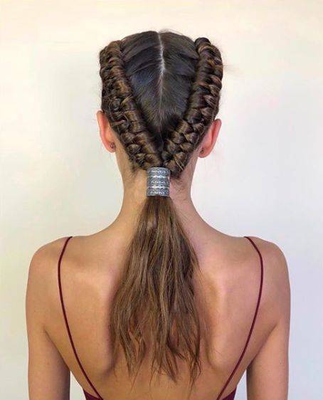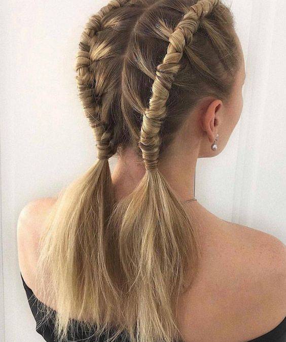 На затылке формируют два хвостика, располагая их друг над другом на малом расстоянии. После скрепляют их между собой, чтобы пряди плавно перетекали друг в друга.