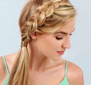 - Длинную челку уложить в виде «французской косы », для этого разделить на три пряди и начать плетение, продвигаясь вдоль кромки волос к затылку.