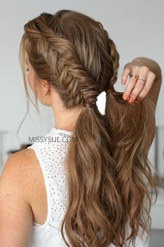 Рыбий хвостик делать несложно – надо просто соединить волосы на затылке, заплести косу, а концы примерно на половину оставить свободными.