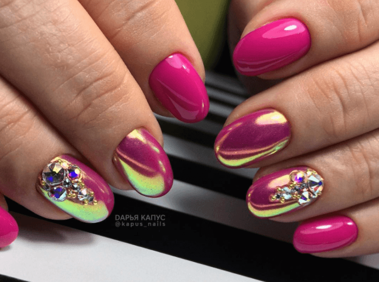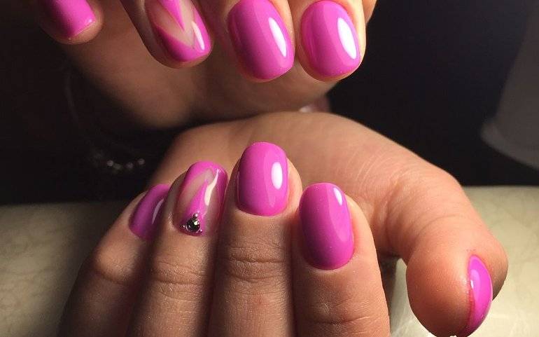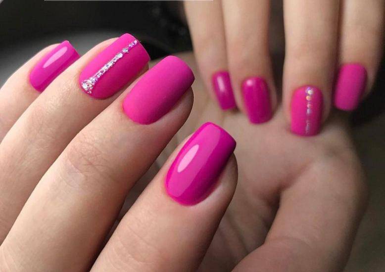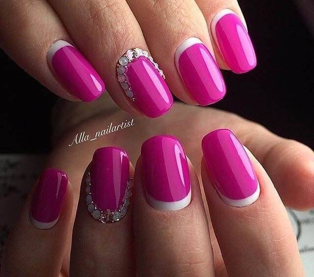 Подходят для короткой длины и насыщенные колера лаков – фуксия, пурпурный, персидский, клубничный, ярко-розовый. Они прекрасно сочетаются с золотой и серебряной фольгой, контрастными полосками, прозрачным фоном или рисунками в растительно-ягодной тематике.