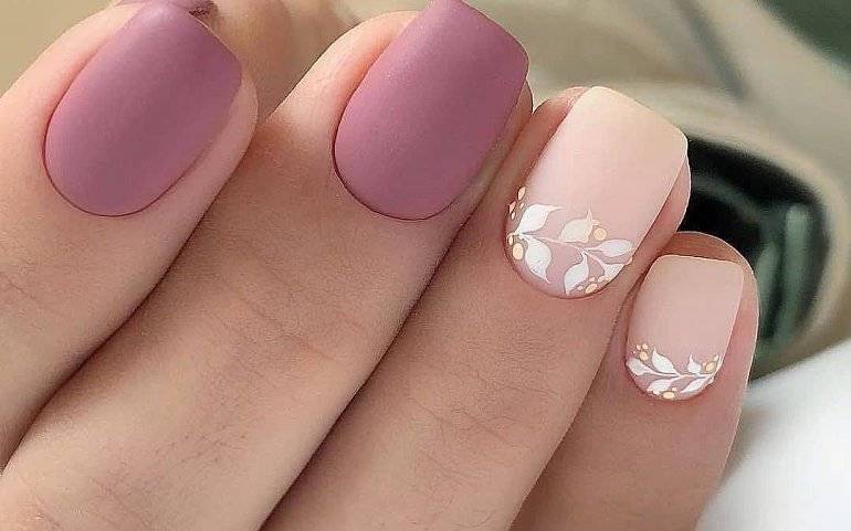 Невероятно красиво подобные гаммы предстают в матовой интерпретации, делая цвет еще более нежным и спокойным. Разнообразить нежно-розовый маникюр с дизайном помогут рисунки и узоры в стиле минимализма: некрупные цветы и листья, полосы, точки.