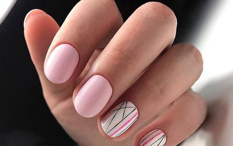 Розовый маникюр с дизайном в сезоне 2022 применим и к коротким ногтям. Главное – не размещать декор и геометрические рисунки по горизонтали, чтобы пропорции ногтя были выровнены, а пластина казалась визуально вытянутой.