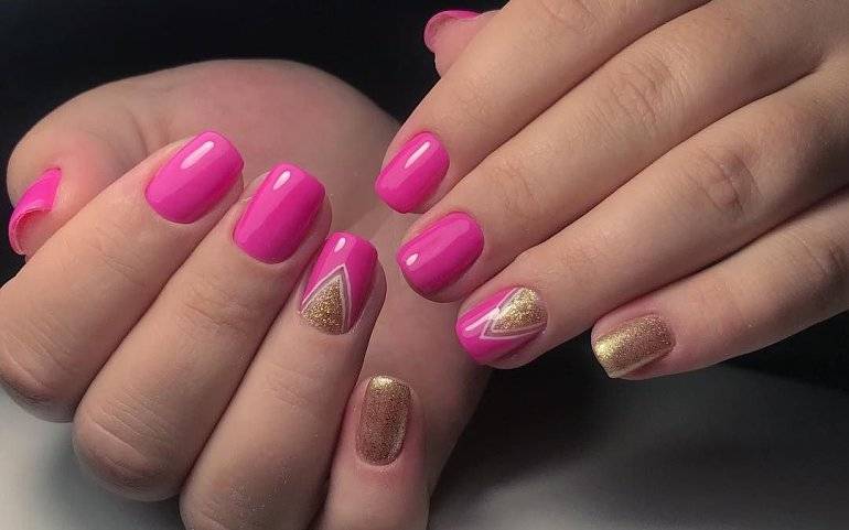 Блеск и золото – одна из самых модных идей для розового маникюра, которое отлично смотрится на любой форме и длине. В качестве дополнения готового дизайна можно выбрать золотые полоски, расположить которые можно по горизонтали, вертикали, диагонали.