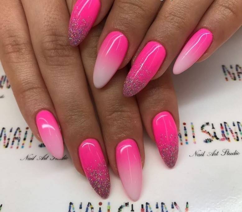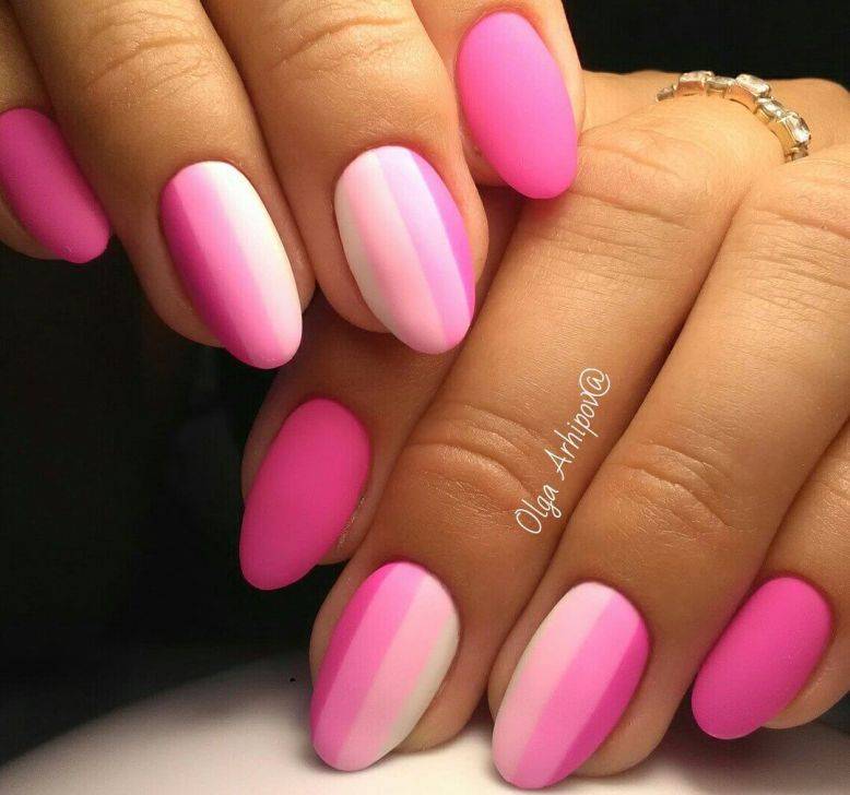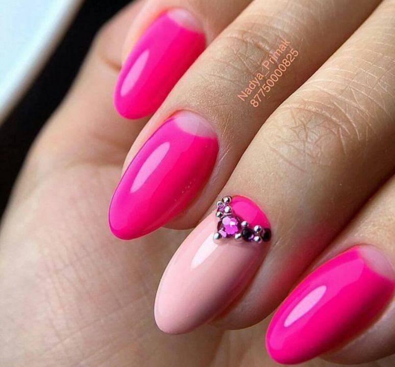 Необычный вариант: ногтевая пластина плавно переходит от ярко-розового к более светлому, а затем к бело-розовому, таким же цветом прорисовывается линия полумесяца у основания ноготка. Нельзя не сказать о розовом френче с эффектом омбре, который всегда очень привлекает модниц.