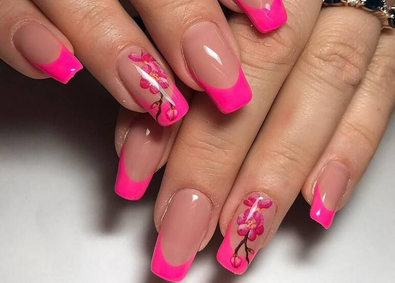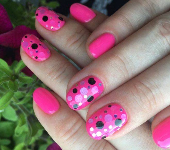 Яркий маникюр с рисунками неоново-розового цвета