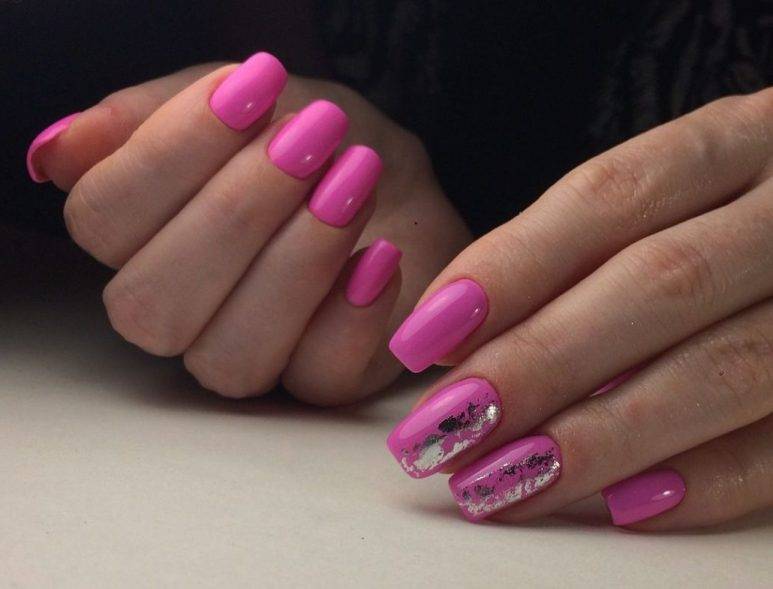 Для холодного розового маникюра лучше выбрать спокойный серебряный цвет, а к более ярким оттенкам подойдет золото. Дополнительное преимущество фольги в том, что с ее помощью можно создавать уникальные дизайны, комбинируя материал с рисунками, стразами и любым другим декором.