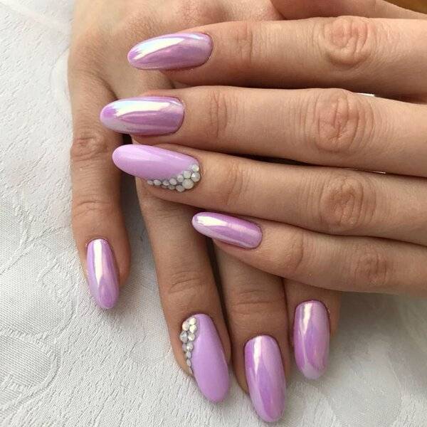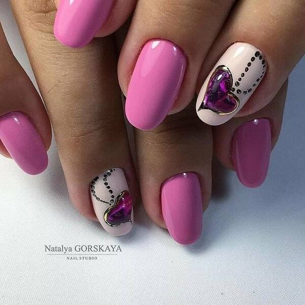 Окончательную точку в конечном результате маникюра поставят блестящие элементы декора. Они выгодно подчеркнут однотонный вариант или же дополнят любой художественный узор, делая нескучным и интересным дизайн ногтей в розовом цвете: