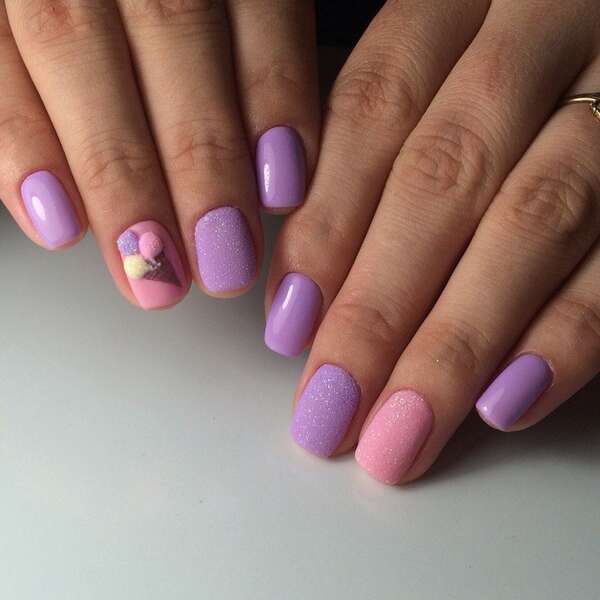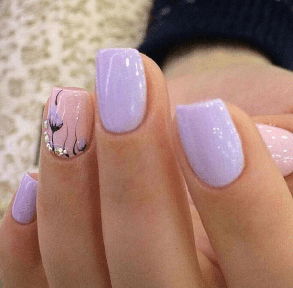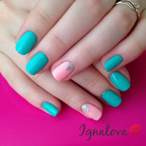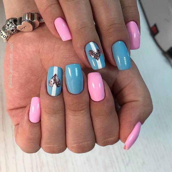 Идеальным сочетанием цветов является розовый с синим, имеющим сиреневый или фиолетовый отлив. Одним из идеальных вариантов является соотношение розового с голубым серебристого оттенка или светло-синим. На кроткие ногти, используя эти комбинации выбирайте более мягкие ненасыщенные цвета.