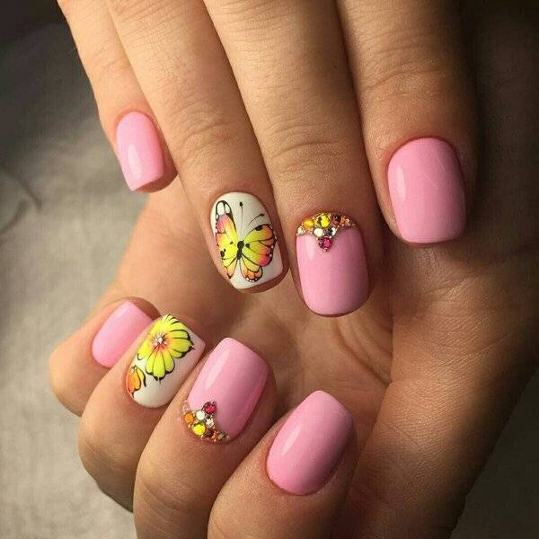 Розовый маникюр с флористическим дизайном может идеально смотреться даже на коротких ногтях или при средней длине пластин: