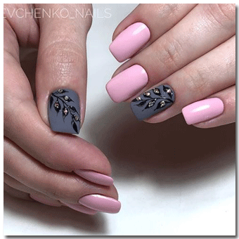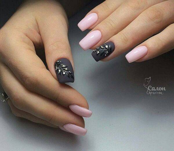 Матовый топ выгодно дополняет оттенки розового, создавая эффект приглушенности в виде маникюра цвета пыльной розы. Топ сделает ногти выделяющимися. Пепельный и дымчатый дизайн женщины предпочитают в спокойных вариантах, но с изюминкой. Блестки или стразы отлично с этим справляются.