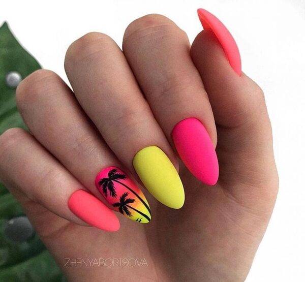 Очень тепло и по-летнему выглядят ногти, оформленные в технике омбре. Мастер выбрал тандем розового с жёлтым и добавил цветочный рисунок с контрастным черным контуром. Получился выразительный и поднимающий настроение дизайн для тёплого времени года, выгодно подчёркивающий смуглость кожи.