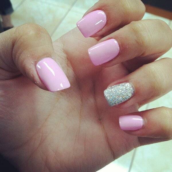 С маникюром розового цвета очень стильно смотрятся всякие стразы, блестки и глиттер — все потому, что сияющие блики крайне выгодно выглядят на нежном, пастельном фоне. Несмотря на это, здесь по-прежнему действует правило минимализма, так что советуем тебе выделять блестящими элементами буквально один ноготь.
