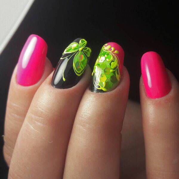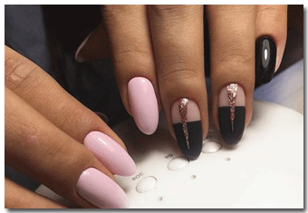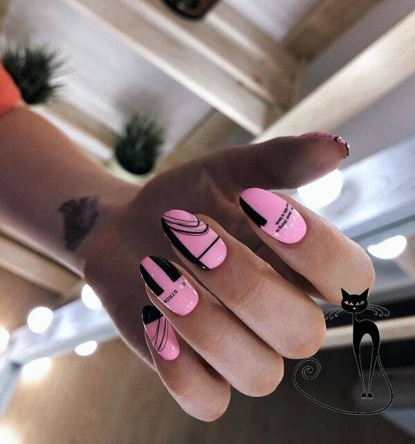 Сочетание розового с черным можно воплотить в геометрических рисунках, кружевах, объемных рисунках на ногтях. Также возможен черно-розовый френч.