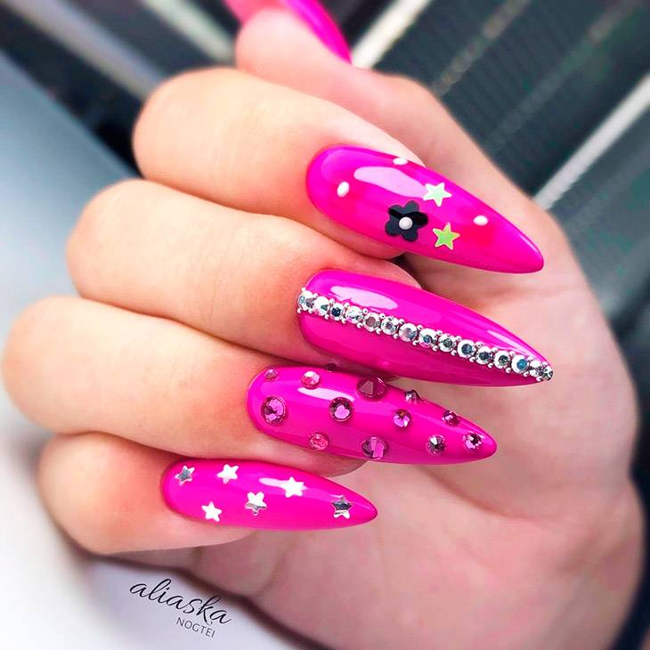 Тем, кто любит обратить на себя внимание и блистать в самом эпицентре праздника, могут понравиться варианты ярко-розового цветочного маникюра, дополненным стразами или блестящим акриловым напылением
