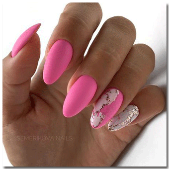 Особую нишу занимает матовый розовый маникюр. Чаще всего его выбирают подружки невесты, так как на ногтях дизайн смотрится нежно и мягко. В качестве дополнения можно использовать градиент, лепку, роспись или небольшие наклейки.