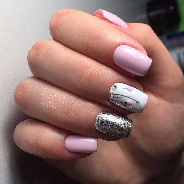 Розовый очень удачно гармонирует с оттенками серого: можно взять этот цвет за основу акцентных ноготков или сделать отдельные штрихи.