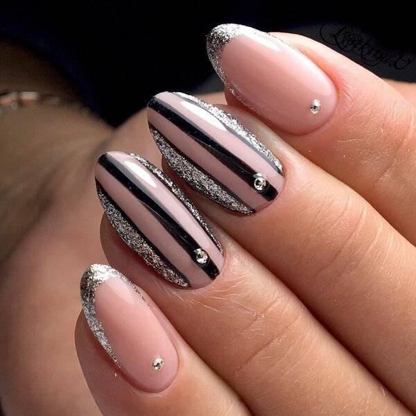 С помощью деликатных страз можно перевоплотить давно привычные классические дизайны: например, на фото ниже мы показали, как круто заиграл французский маникюр в розовых тонах, когда линию “улыбки” выполнили стразами. Блестки можно умело внедрить в антифренч, сделав плавную растяжку — так твои ногти будут казаться еще уже и длиннее. Ну а если хочется что-то попроще, всегда можно выделить один ноготь блестящим лаком — вроде бы сделала однотонное покрытие без дизайна, а смотрится все очень стильно.