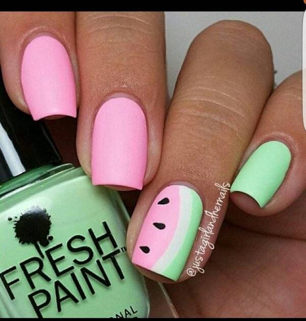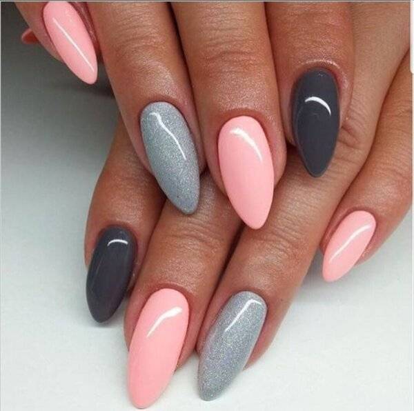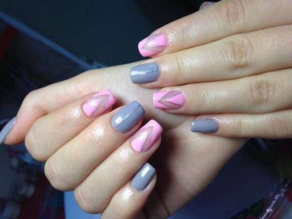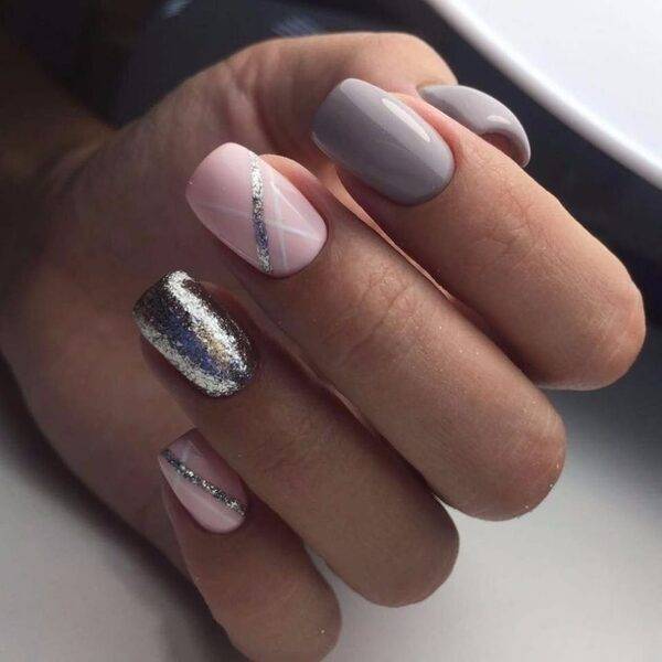 Серебристо-серый оттенок выгодно подчеркивает освежающий оттенок маникюра. Возьмите розовый за основу, а с помощью серого лака можно нанести полоски или сделать градиент.