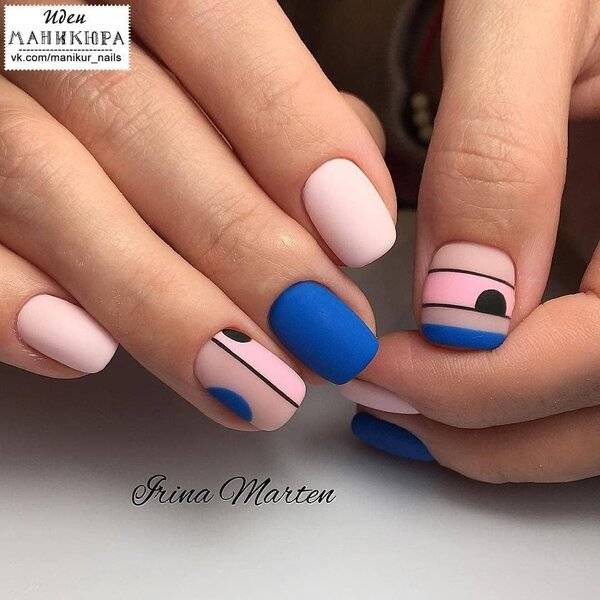 Подсказка! Не рекомендуется использовать сразу два ярких окраса, поскольку розовый подчеркивает усиливает синий цвет. Яркие тона розового и синего будут выглядеть слишком утомительно и броско. Именно поэтому ярко синий применяйте только в комбинации с бледно-розовым лаком.