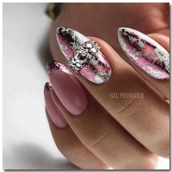 Для холодного розового маникюра лучше выбрать спокойный серебряный цвет, а к более ярким оттенкам подойдет золото. Дополнительное преимущество фольги в том, что с ее помощью можно создавать уникальные дизайны, комбинируя материал с рисунками, стразами и любым другим декором.