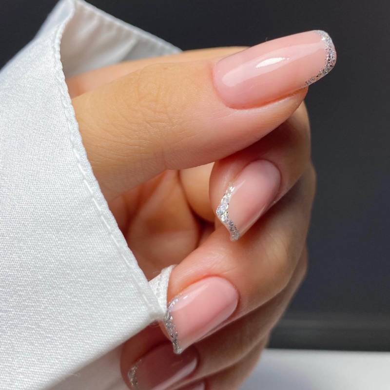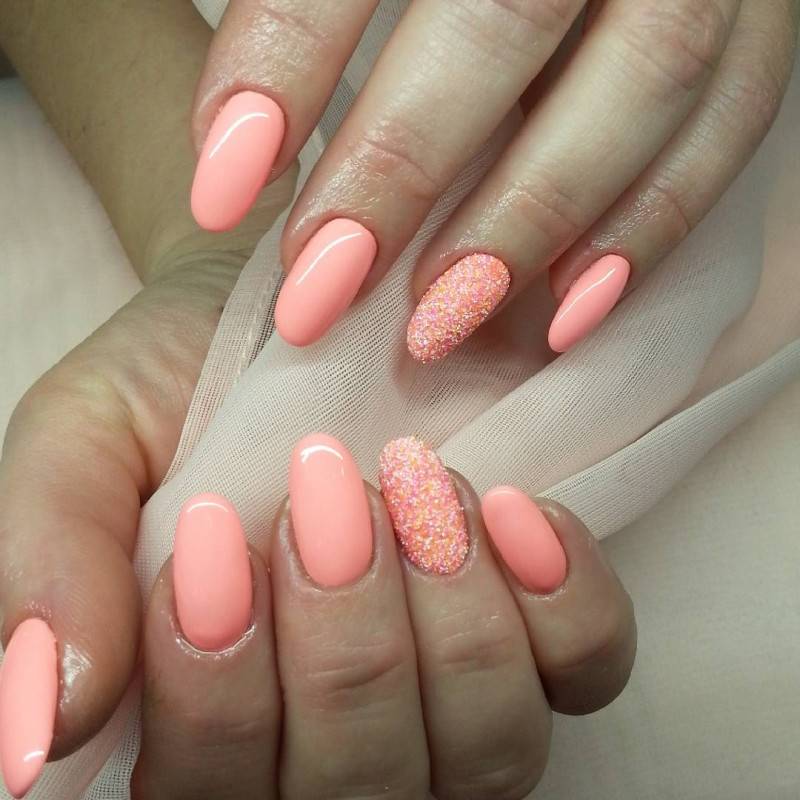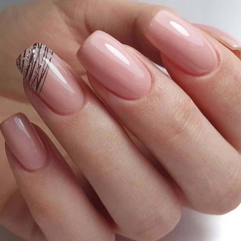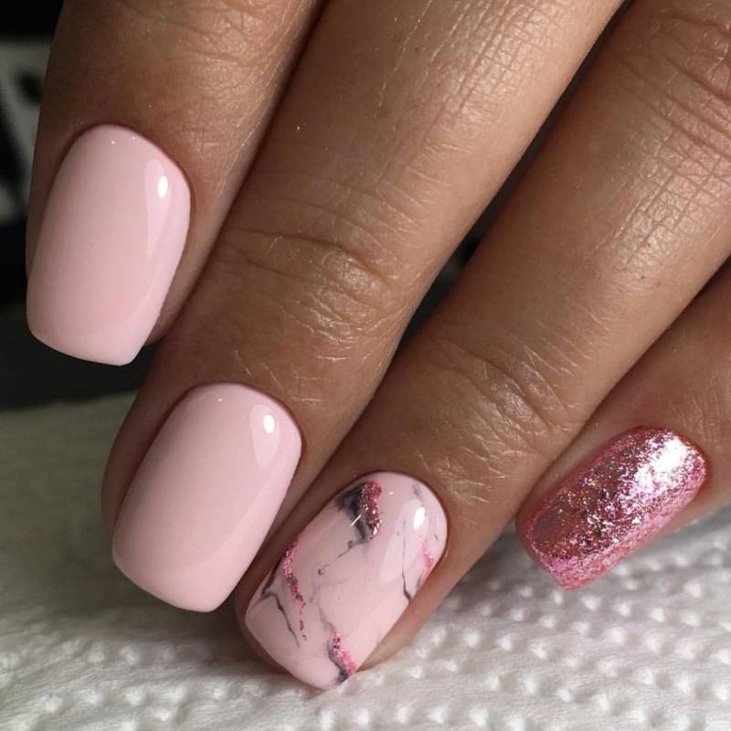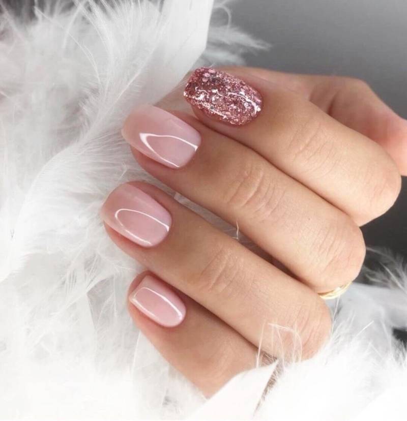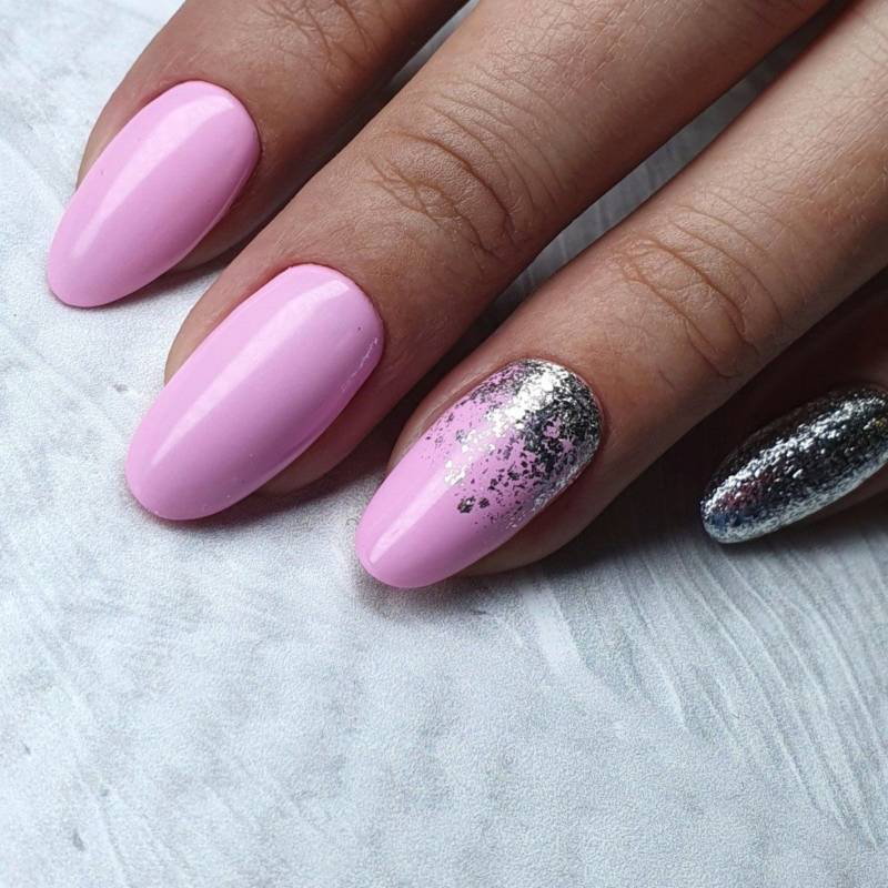 Разнообразить классический однотонный маникюр можно добавлением блесток. В сезоне 2022 в тренде растяжка, выполненная блестками разного цвета и размера. С розовым цветом очень красиво смотрятся как копирующие цвет блестки, так и золото с серебром.