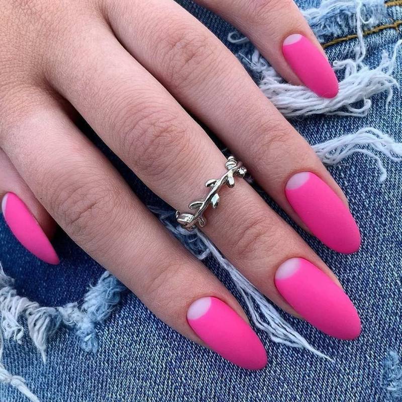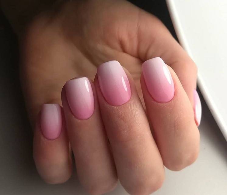 Необычный вариант: ногтевая пластина плавно переходит от ярко-розового к более светлому, а затем к бело-розовому, таким же цветом прорисовывается линия полумесяца у основания ноготка. Нельзя не сказать о розовом френче с эффектом омбре, который всегда очень привлекает модниц.