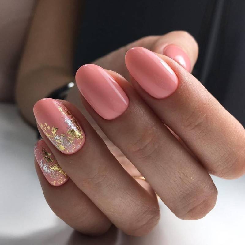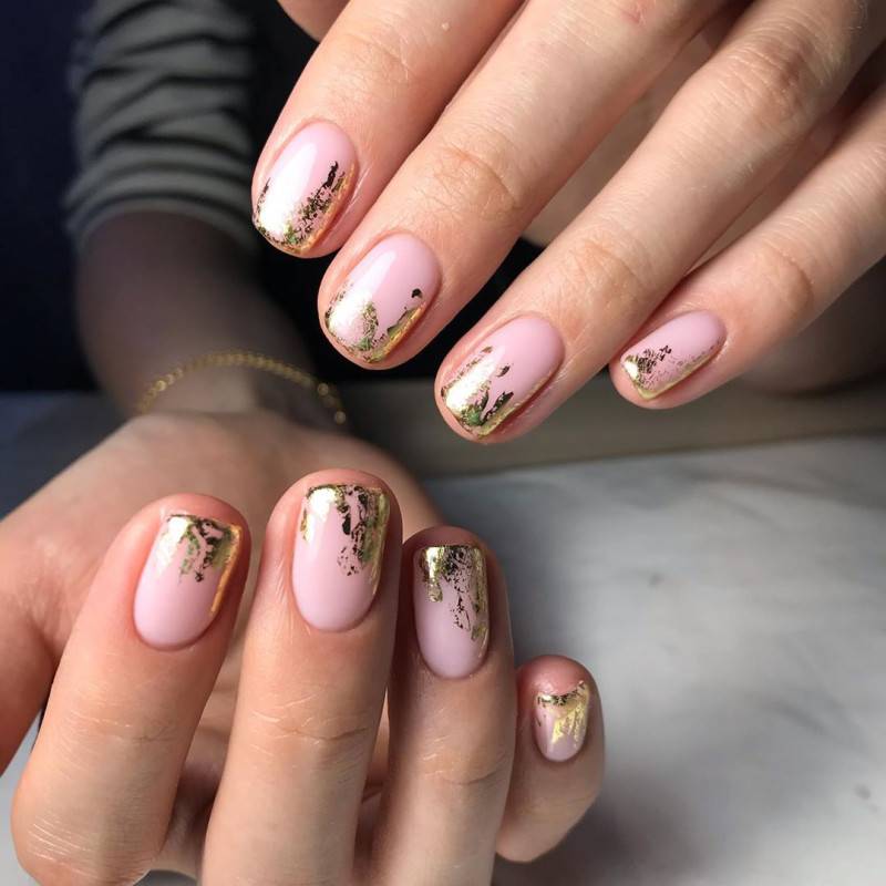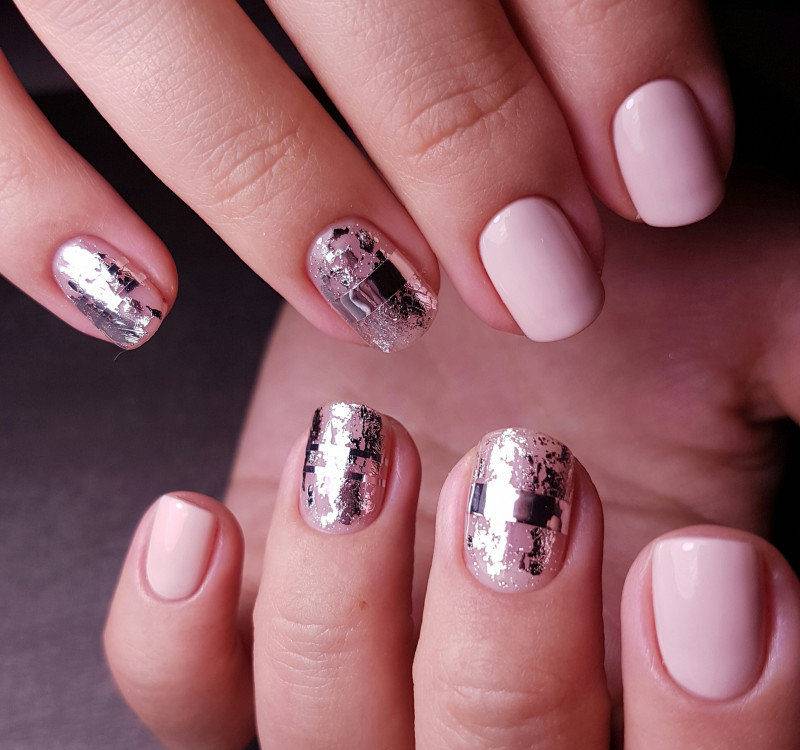 Даже незначительный кусочек блестящей фольги сможет украсить розовый маникюр. Золотистая фольга больше подходит для нюдовых тонов, а разноцветная и серебряная – для более ярких.