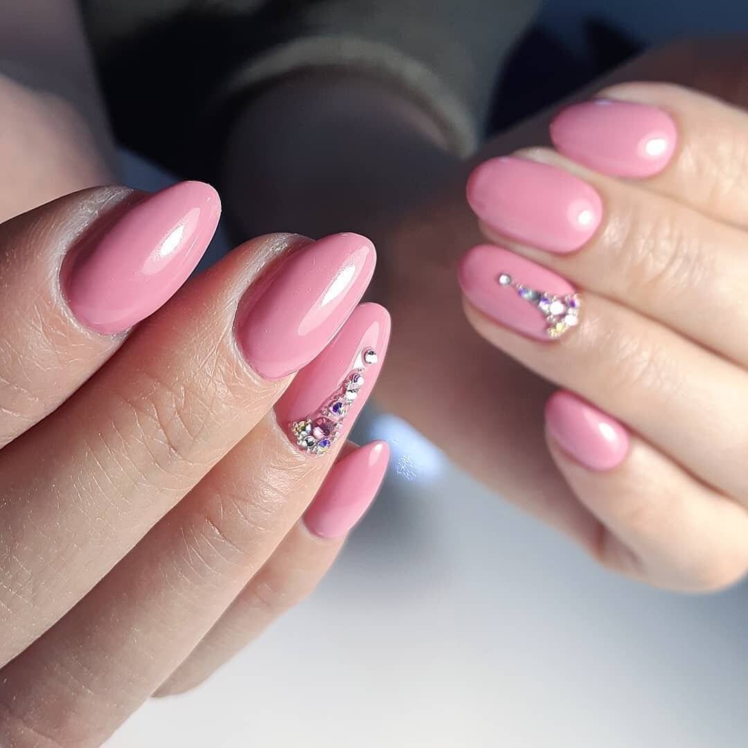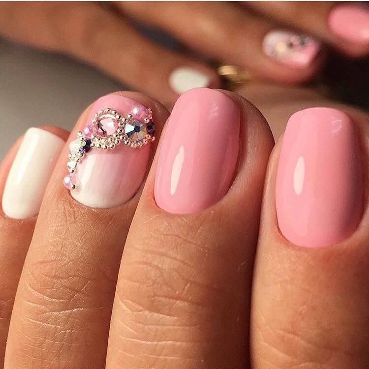 Красиво «рассыпанные» по ноготкам бусины и кристаллы никогда не испортят монохром в маникюре. Идеи оформления стразами розовых ноготков различны: