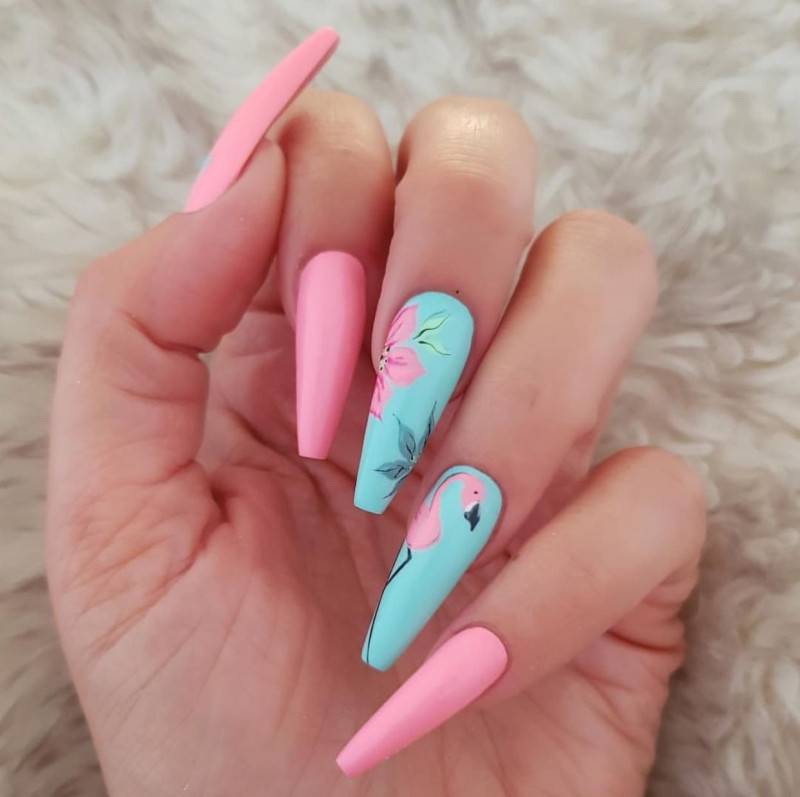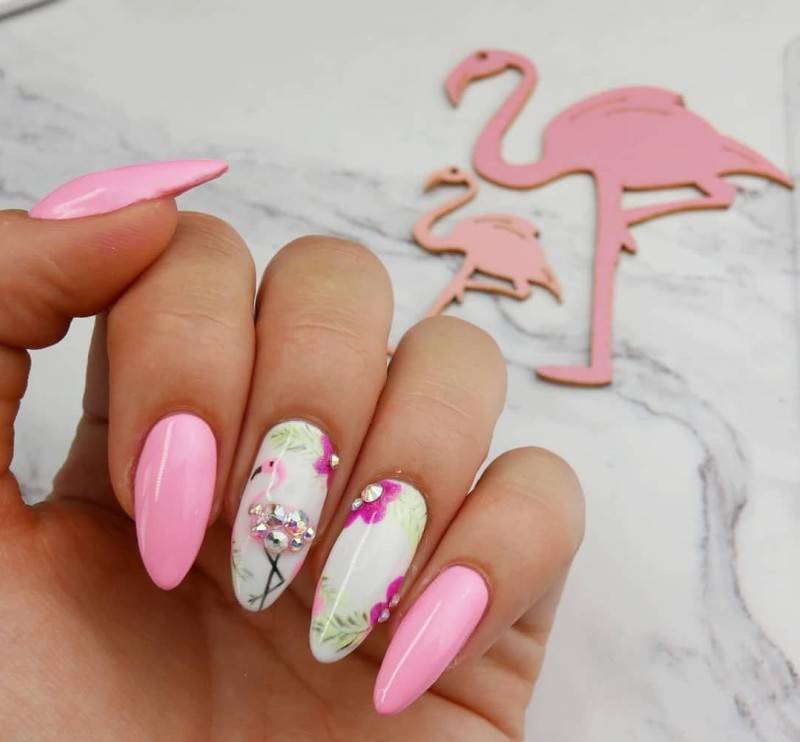 Розовый маникюр просто немыслим без птицы аналогичного цвета. Мастера довольно часто в сезоне 2022 будут использовать рисунки или наклейки с изображением фламинго. Интересно, что фоном должно стать именно розовое покрытие, которое смотрится в «паре» с птицей невероятно гармонично.
