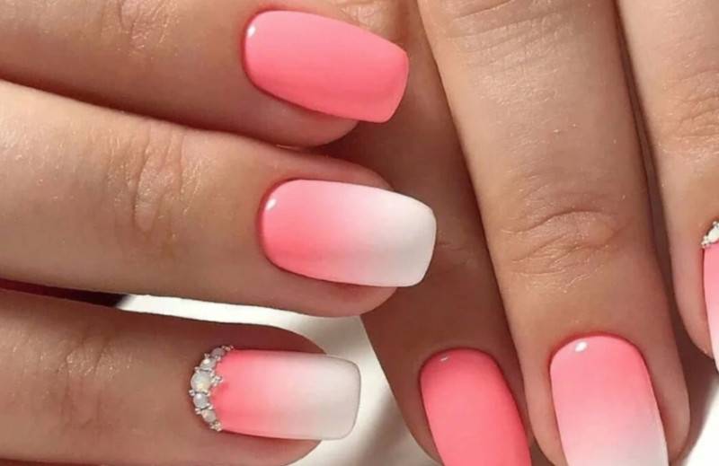 Интересно смотрится лунный маникюр в сочетании с техникой омбре, для выполнения которого взяты белый и яркий розовый лаки.
