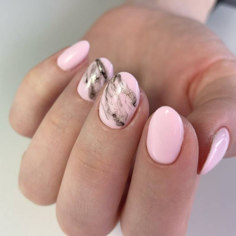 Мраморный розовый на ноготках подкупает модниц своей нежностью и легкостью, представляя собой рисунок натуральных камней. Такой дизайн можно выполнять как на всех ноготках, так и на одном или двух. Эффектно дополняется мраморный дизайн втиркой с зеркальным блеском.