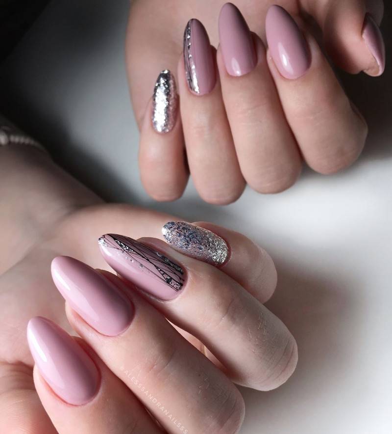Очень модно в 2017 использовать в нейл-арте металлизированные лаки. Если хочется сделать стильный и милый маникюр для романтического свидания или вечером, можно взять спокойный нюдовый оттенок в качестве основы и совместить его с серебристым покрытием, выделить им лунки и полностью окрасить акцентные ноготки.