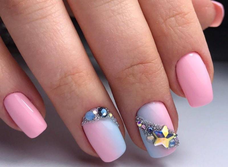 Впечатляющая инкрустация, полоска из бульонок, дополненная камушками, в розовом маникюре – хит сезона 2022.