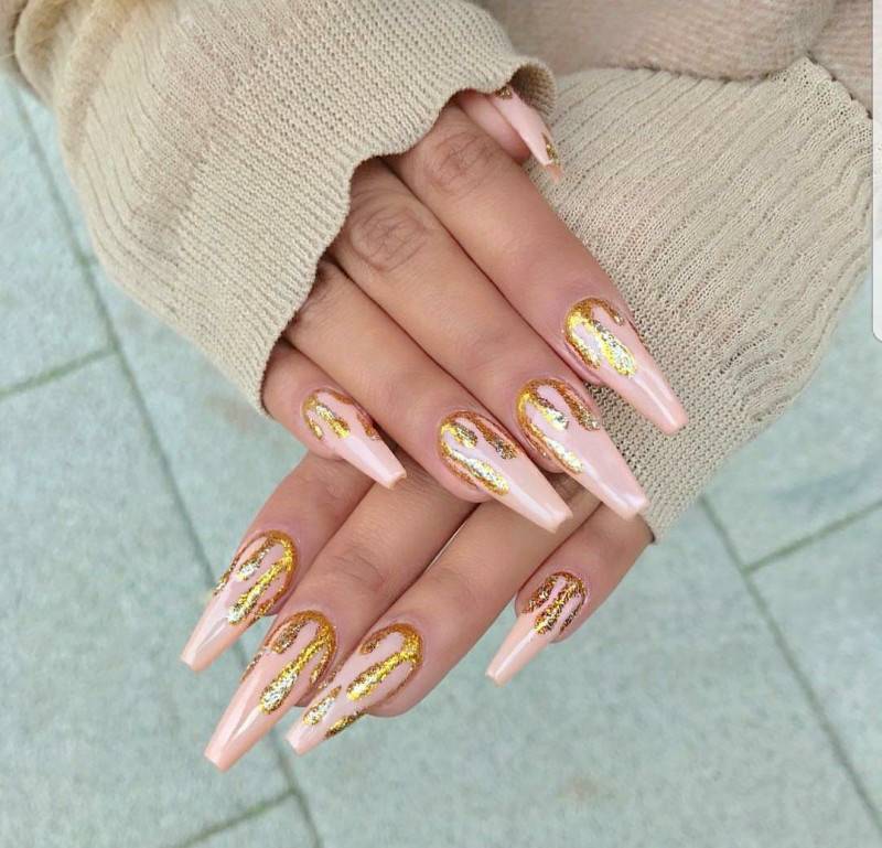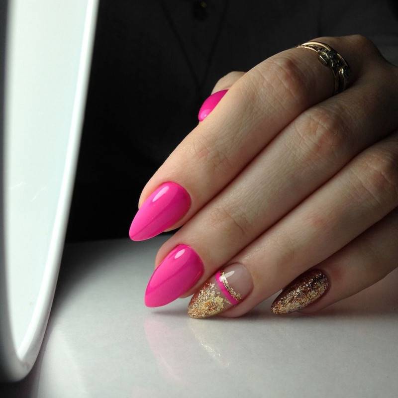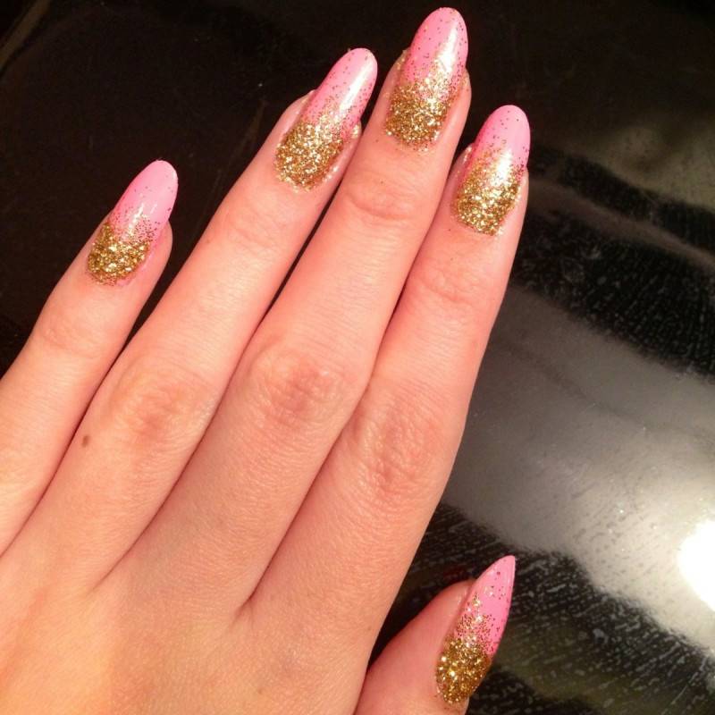 Блеск и золото – одна из самых модных идей для розового маникюра, которое отлично смотрится на любой форме и длине. В качестве дополнения готового дизайна можно выбрать золотые полоски, расположить которые можно по горизонтали, вертикали, диагонали.