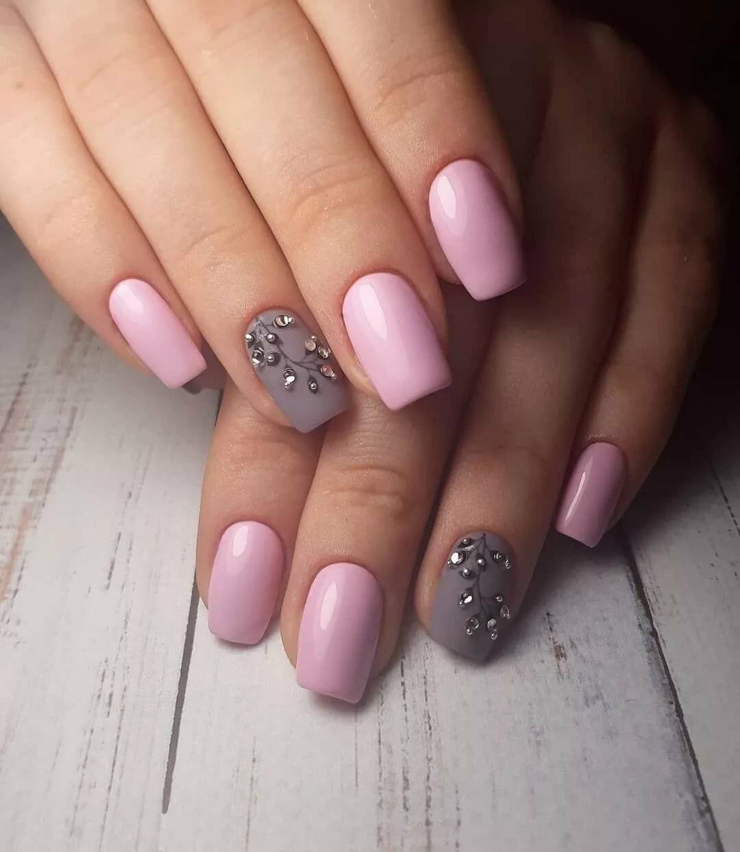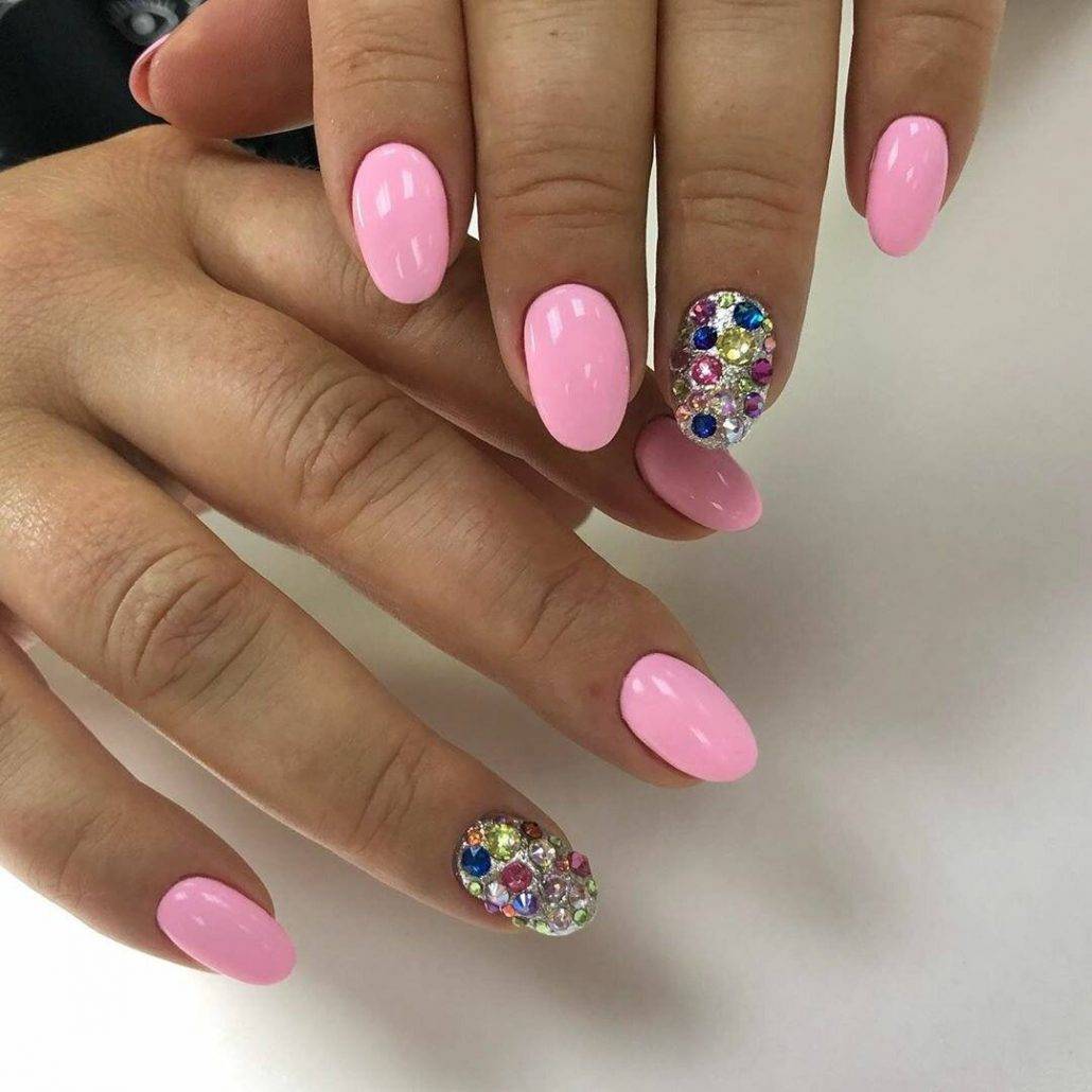 Красиво «рассыпанные» по ноготкам бусины и кристаллы никогда не испортят монохром в маникюре. Идеи оформления стразами розовых ноготков различны:
