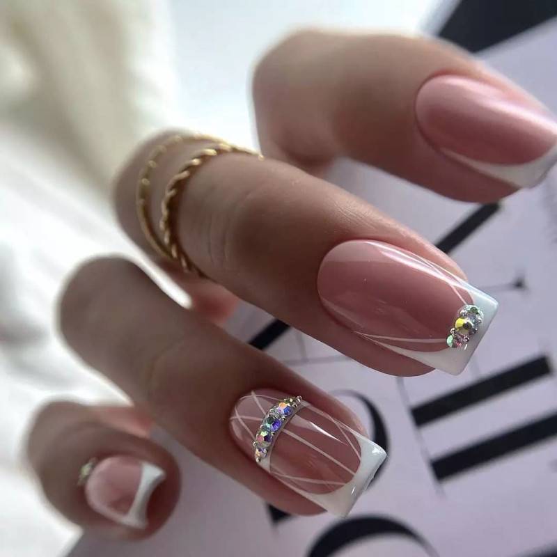 Впечатляющая инкрустация, полоска из бульонок, дополненная камушками, в розовом маникюре – хит сезона 2022.