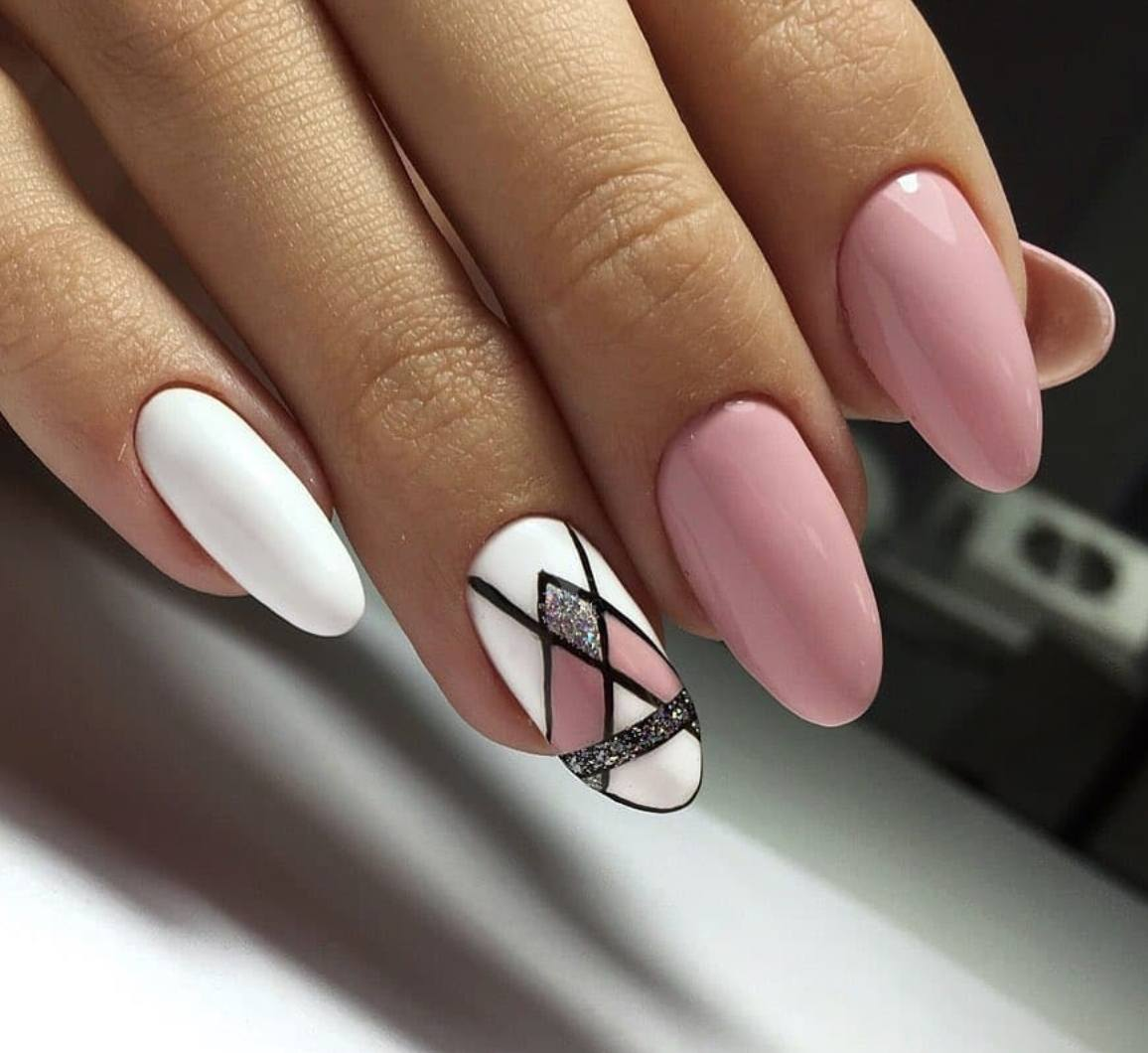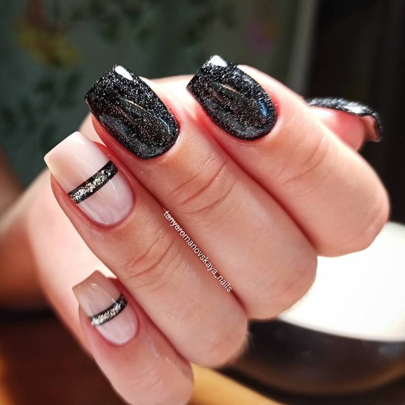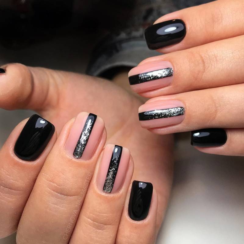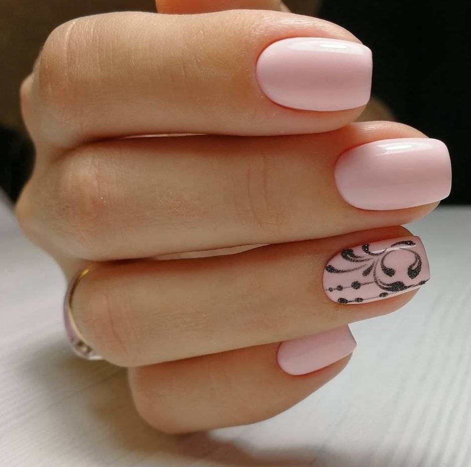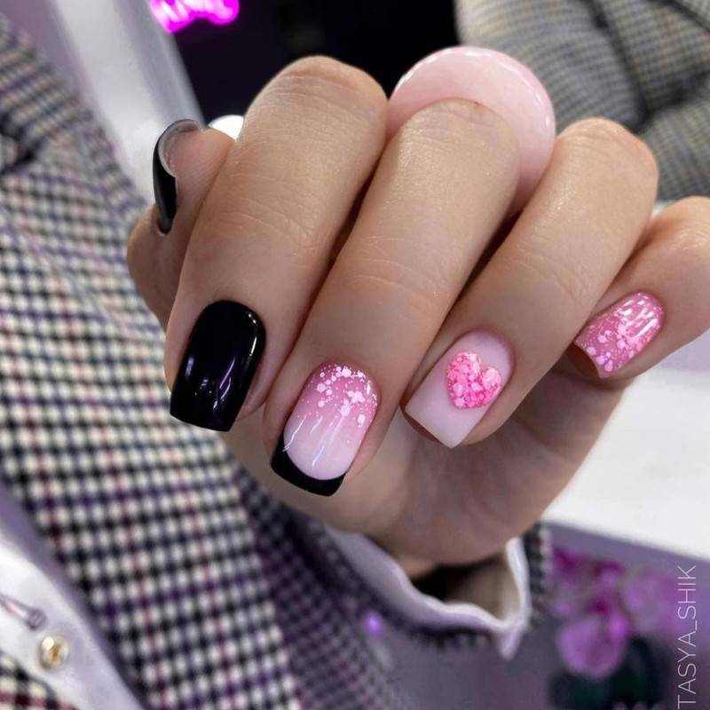 Ниже мы подобрали несколько идей маникюра в розовых тонах с вкраплением черного. Посмотри, насколько эффектно смотрится френч — мы бы не догадались так интересно скомбинировать эти два цвета. Чтобы усилить глубину черного, в некоторых дизайнах можно использовать черный песок или добавить немного серебряного глиттера.