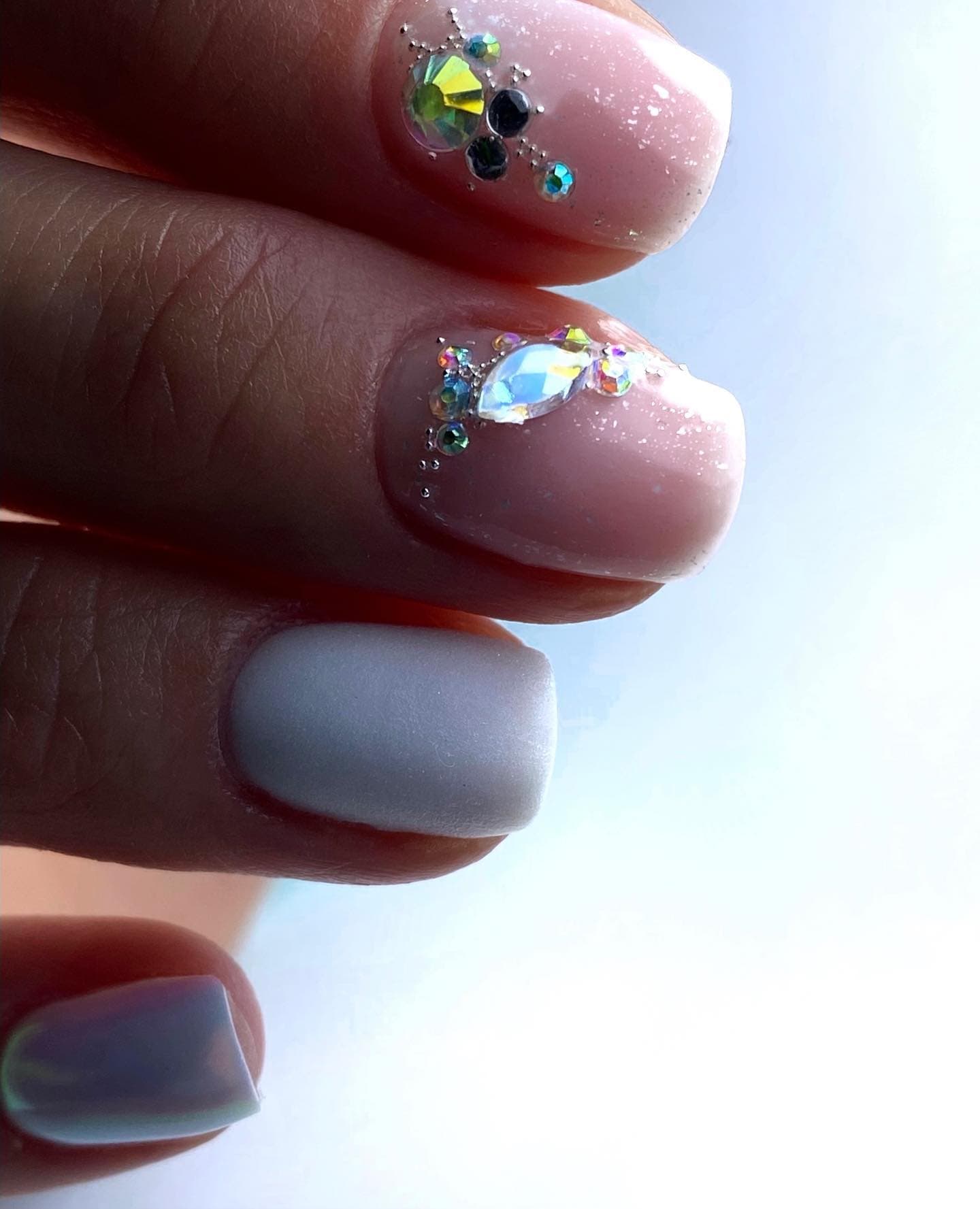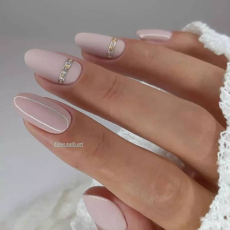 Светло-розовые матовые ноготки можно дополнить стразами и блестками. Также очень красиво будет смотреться френч.